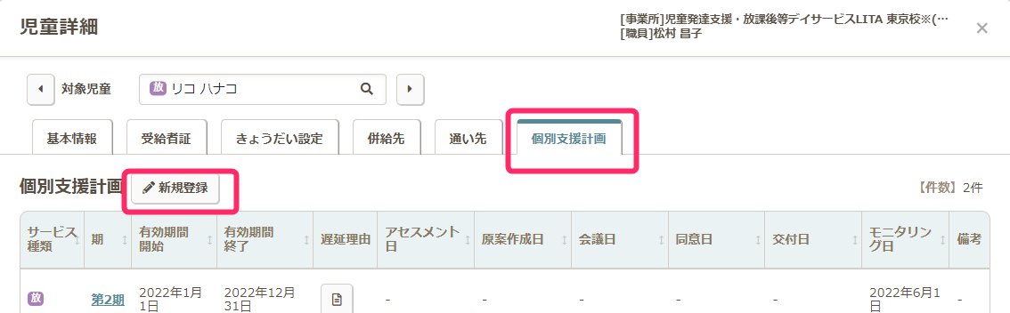 - 【個別支援計画】のタブをクリックし、新規登録のボタンから有効期間を登録します。