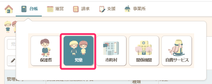 - 【台帳】の【児童】から、該当児童の名前をクリックします。