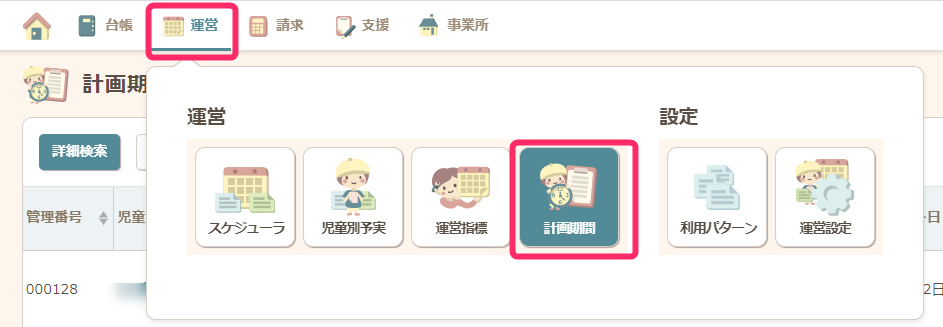 ・【支援】で計画内容の登録と、計画期間の管理を行います。