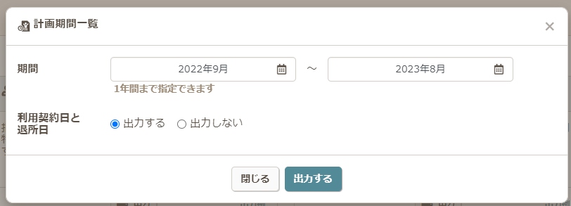 - 計画期間一覧の出力画面が表示されますので、必要な期間を設定し出力します。
