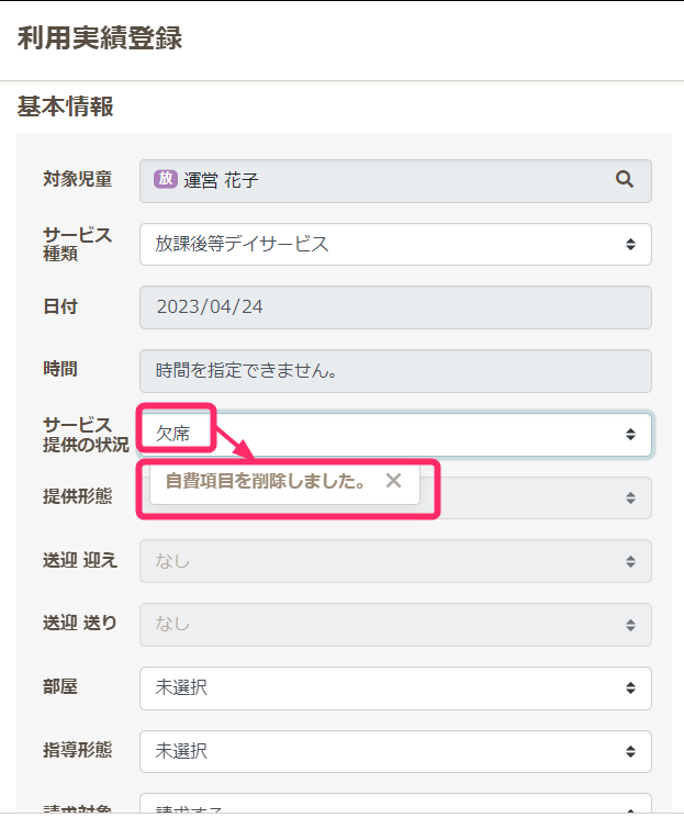 - サービス提供の状況を【欠席】または【欠席(加算なし)】を選ぶと、一旦自費項目が削除されます。【自費項目が削除されました】のメッセージが表示されます。