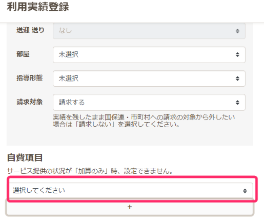 - 欠席でも自費項目を請求したい場合は、【自費項目】の「+」をクリックし、登録済みの自費項目から選択してください。