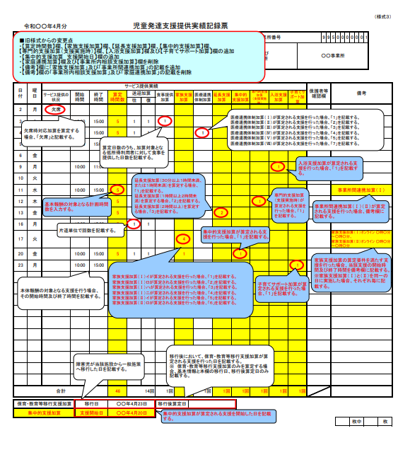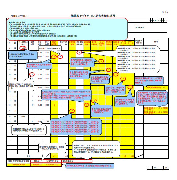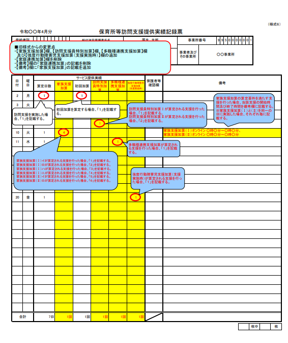 - 令和6年の報酬改定にあたり、実績記録票のフォーマットが変更されています。