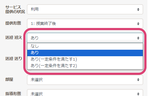 - 重症心身障害児については、職員の付き添いが必要。職員が同乗していない場合は送迎「あり」を選択してください。