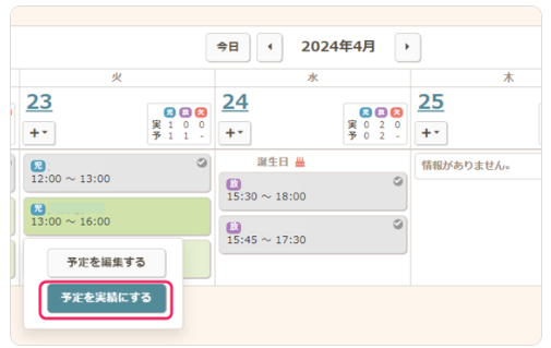 グローバルナビ【運営】から、【スケジューラ】をクリックし、該当児童をクリックして実績の編集画面を開きます。