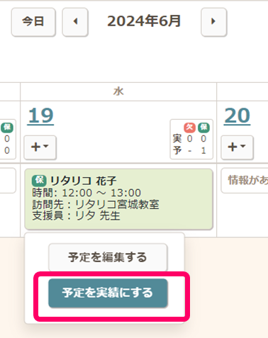 - グローバルナビ【運営】から、【スケジューラ】をクリックし、該当児童をクリックして実績の編集画面を開きます。