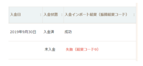 利用者様の口座が残高不足である場合や、口座振替依頼書がない場合等があります。結果コードに基づく入金失敗の原因に関して、詳しくは収納代行業者にお問い合わせください。