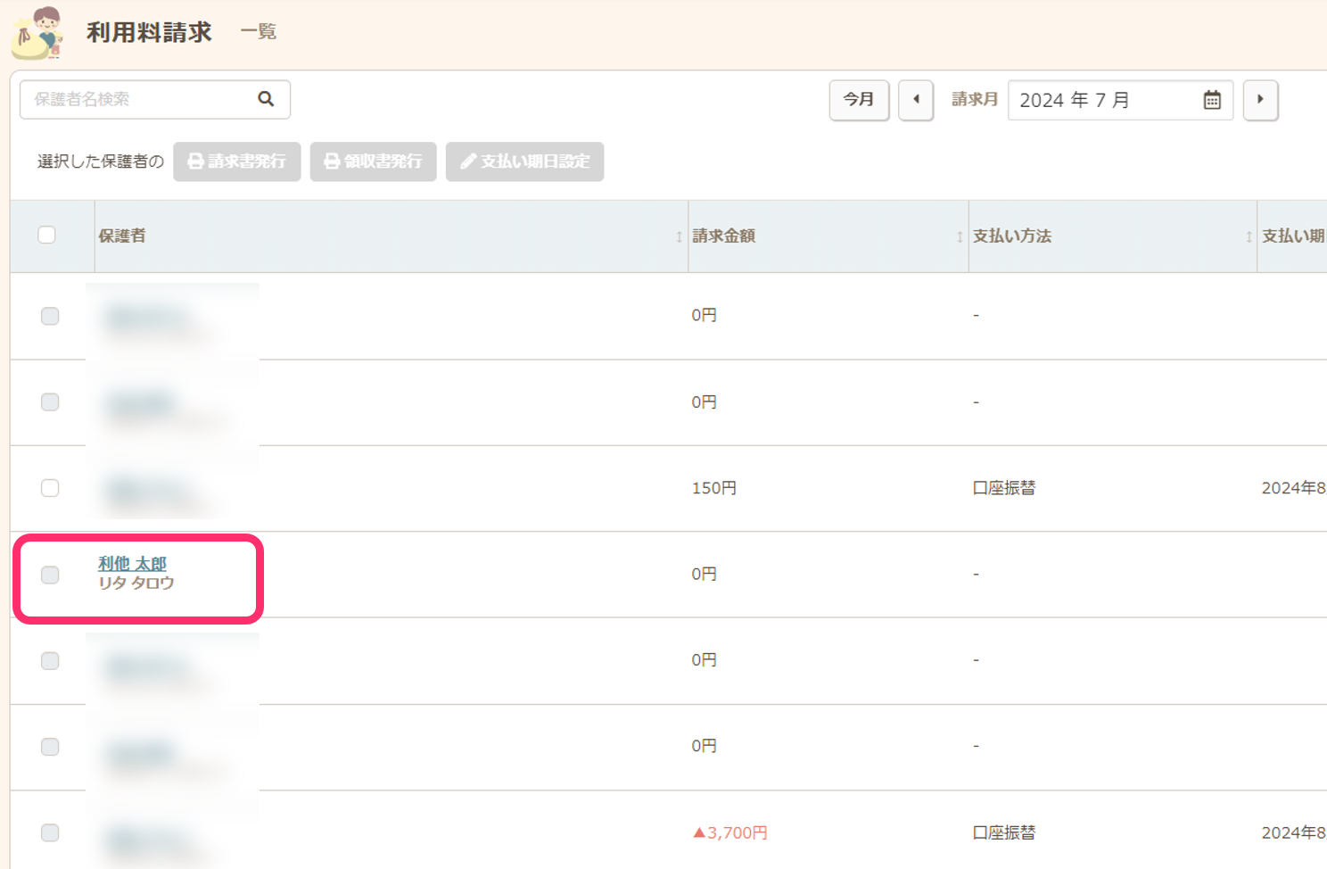 - 一覧で、保護者を選択します。