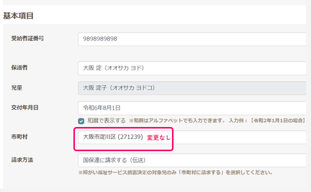 ・受給者証>基本項目>市町村は変更なし