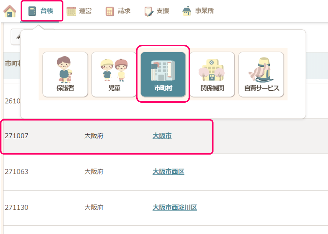 - 【台帳】の【市町村】で、新規登録をクリック。市町村番号 [大阪市 271007]を登録します。