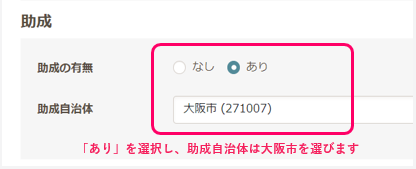 ・自治体助成 あり 自治体は「大阪市 271007」を選択
