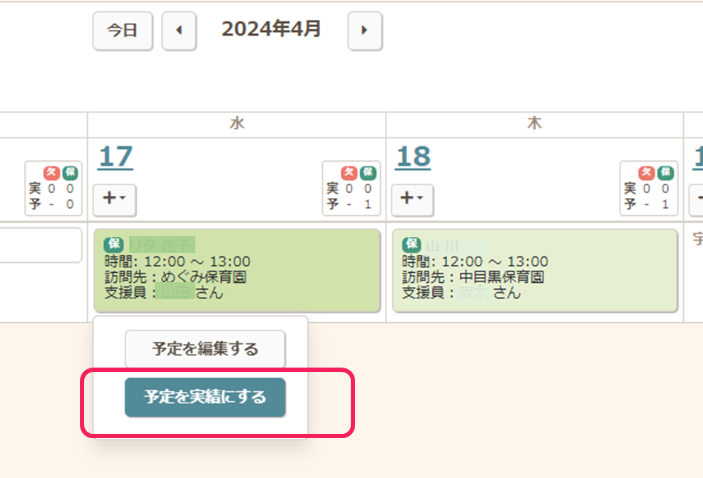 グローバルナビ【運営】から、【スケジューラ】をクリックし、該当児童の実績の編集画面を開きます。