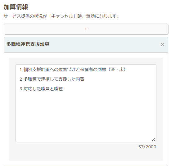 加算情報の下の+ボタンをクリックし、多職種連携支援加算を選択します。
