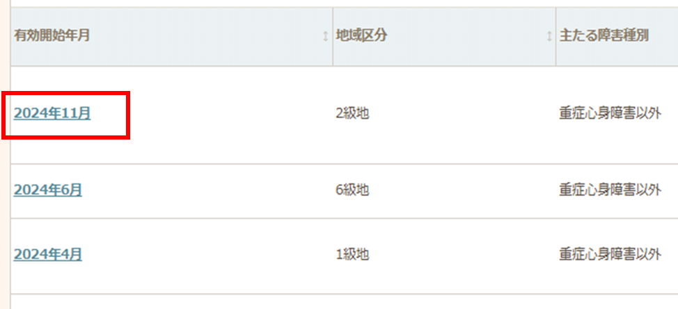 - 確認するサービス種類のタブを選択し、該当する有効開始年月日をクリックします。