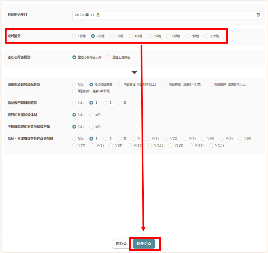 - 地域区分で選択されている級地に誤りがないか確認し、誤りがある場合は正しい級地を選択し、【保存する】をクリックします。