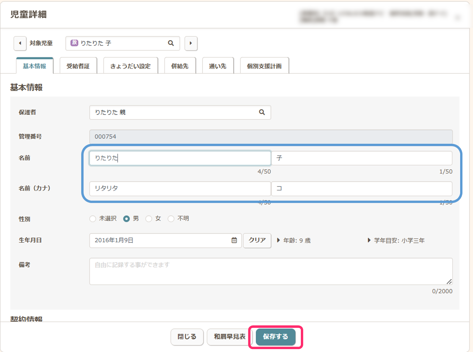 - 基本情報内で児童の名前を修正し、「保存する」をクリックします。