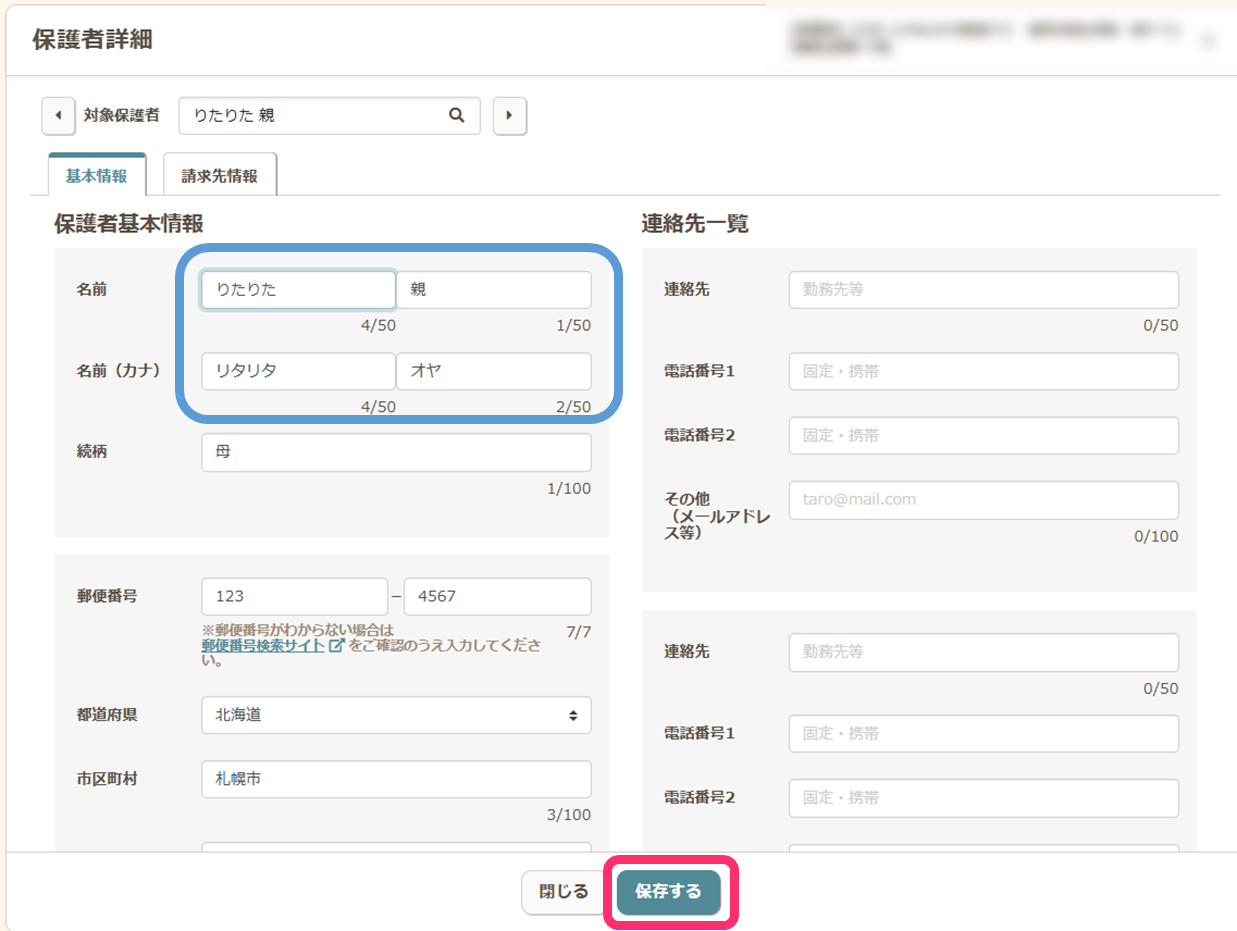 - 基本情報内で保護者の名前を修正し、「保存する」をクリックします。