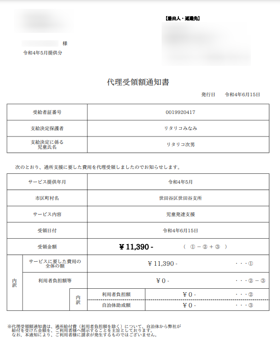 - 法廷代理受領により市町村から事業所に給付費の支払いを受けた際、利用者に対して事業所に支払われる給付費の金額をお伝えするための書類です。代理受領額通知書は、利用者に報告する義務があります。