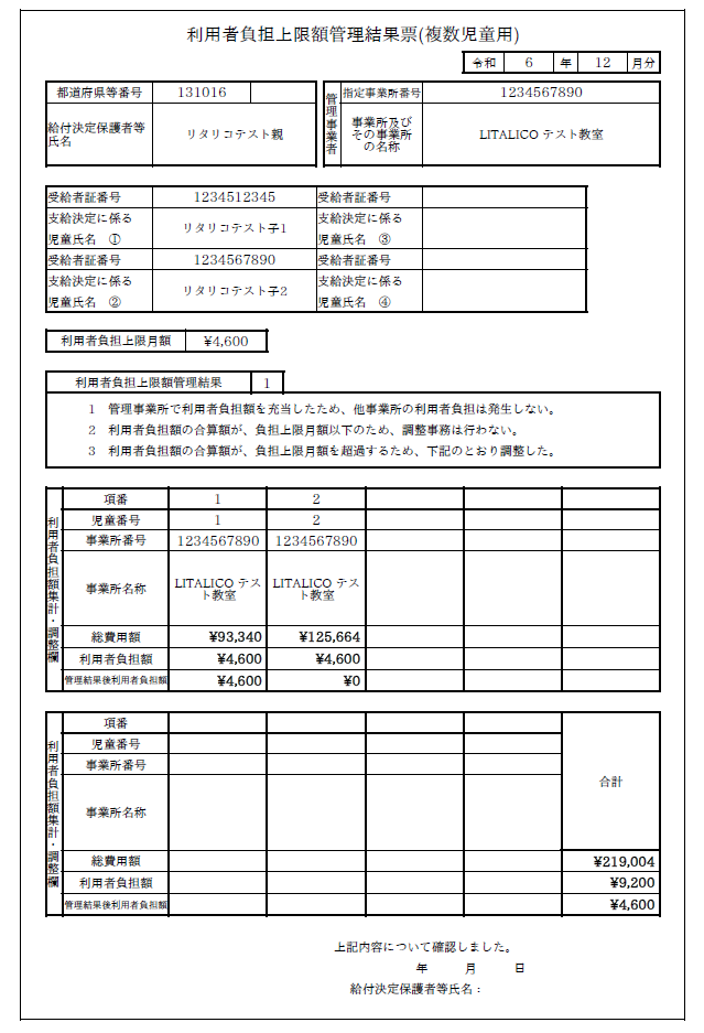 【上限額管理結果票(複数児童用)】見本