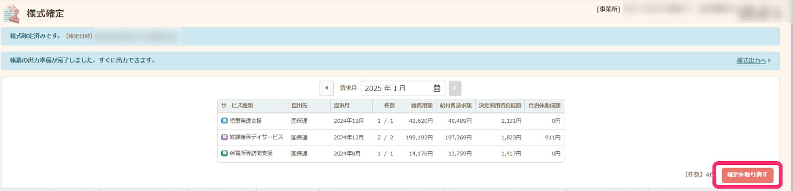 様式確定後に上記修正を行う場合、請求>様式確定で最新の請求月の「確定を取り消す」を行ってから修正作業を行ってください。