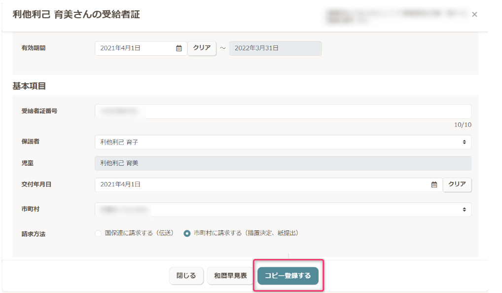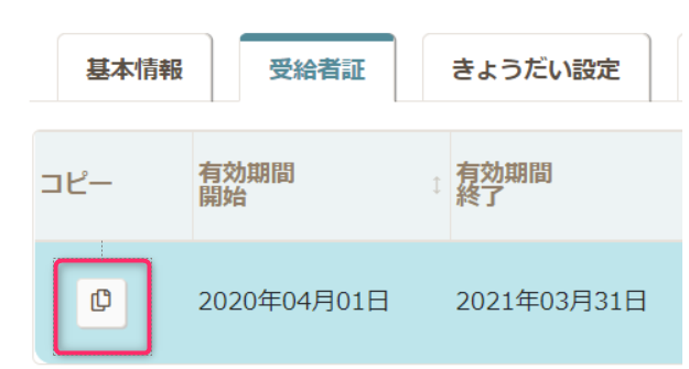 - 「受給者証」タブをクリックし、 『コピー』をクリックします。