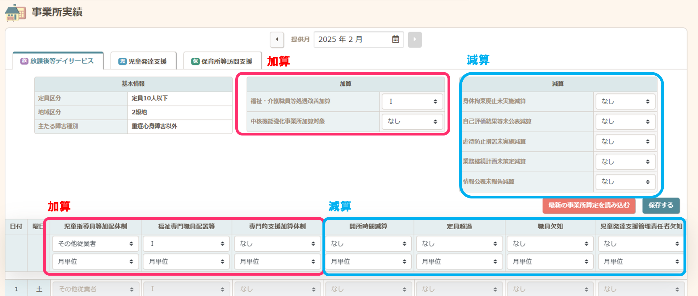 【事業所実績】では、事業所全体の加算や減算を登録できます。