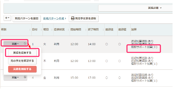 - 個別サポート加算が算定されている日の【実績】のボタンをクリックし、