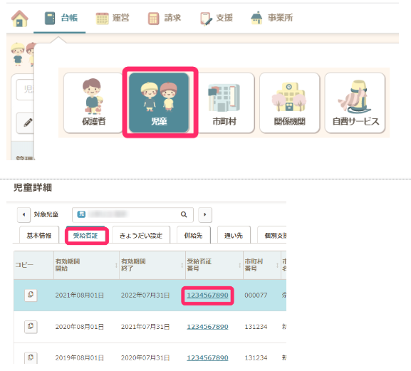 該当児童の受給者証を確認し、登録内容に誤りがないかを確認します。