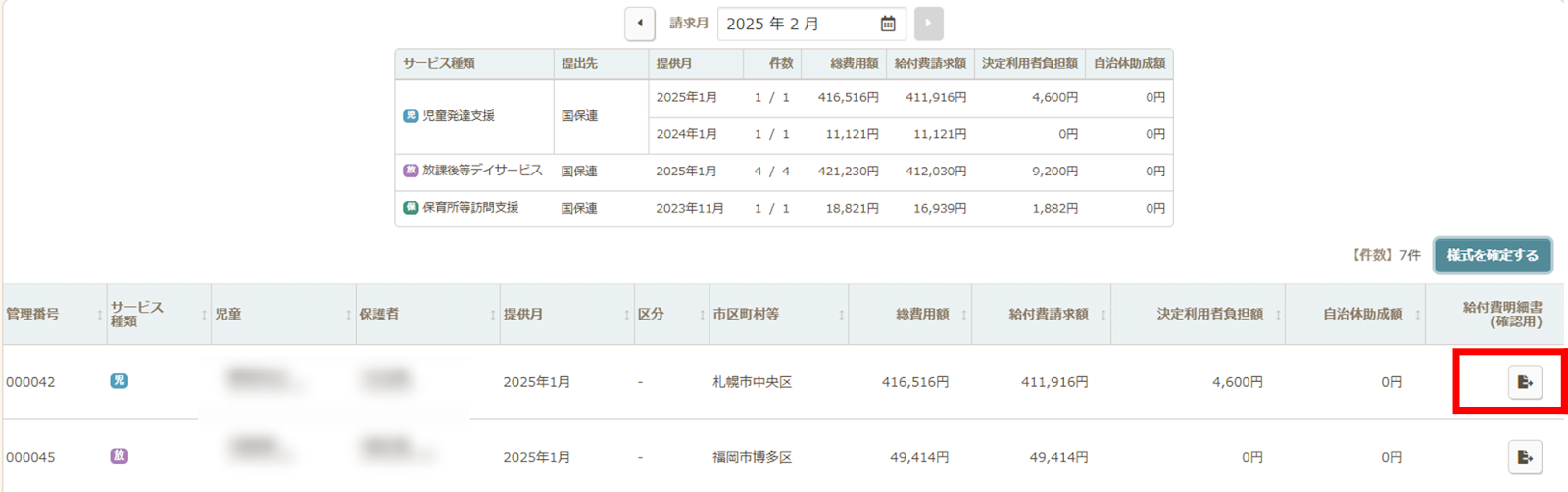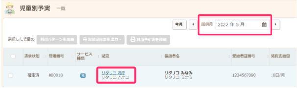 - 一覧から返戻設定する提供月を選択し、 児童名をクリックします。