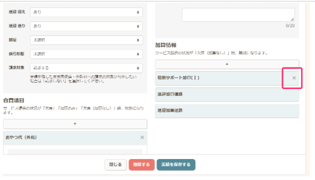 利用実績編集画面の加算情報の【個別サポート加算(Ⅰ)】の項目の✖をクリックし、加算を削除します。