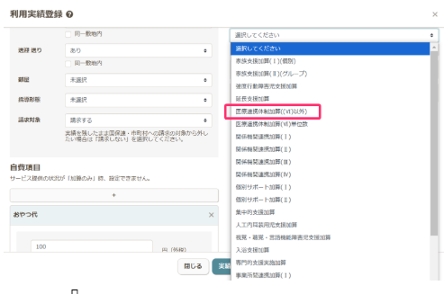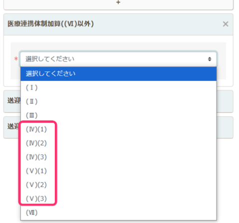加算情報の下の+ボタンをクリックし、医療連携体制加算を選択し、Ⅳ、Ⅴの区分を選びます。