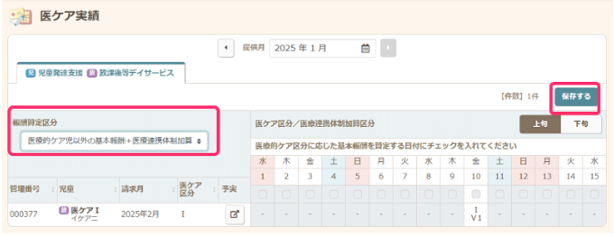 【請求】の【医ケア実績】で、報酬区分を「医療的ケア児以外の基本報酬+医療連携体制加算」を選択し「保存」をクリックします。