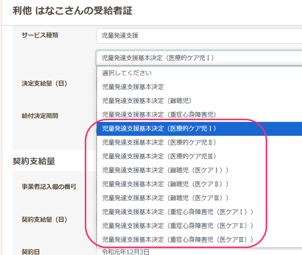 - 該当児童の受給者証を開き、サービス種別で(医療的ケア児)を選択し、「保存」します