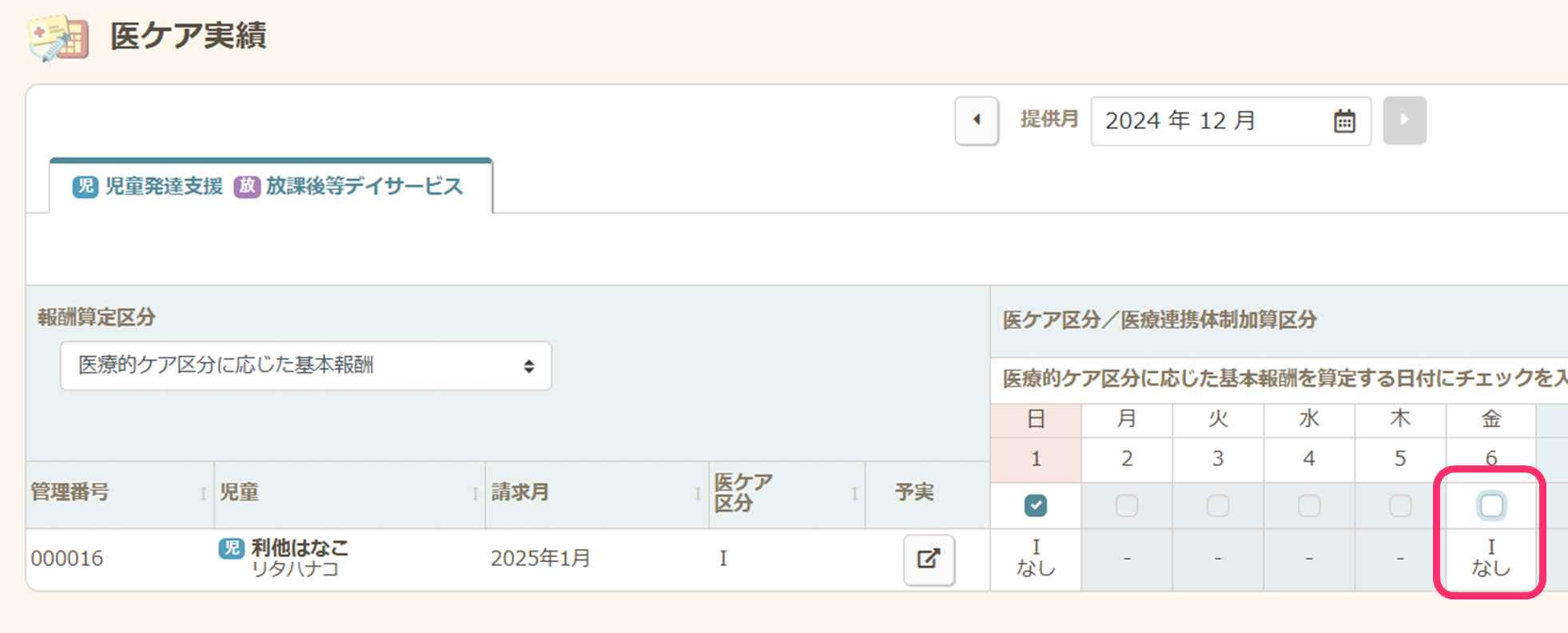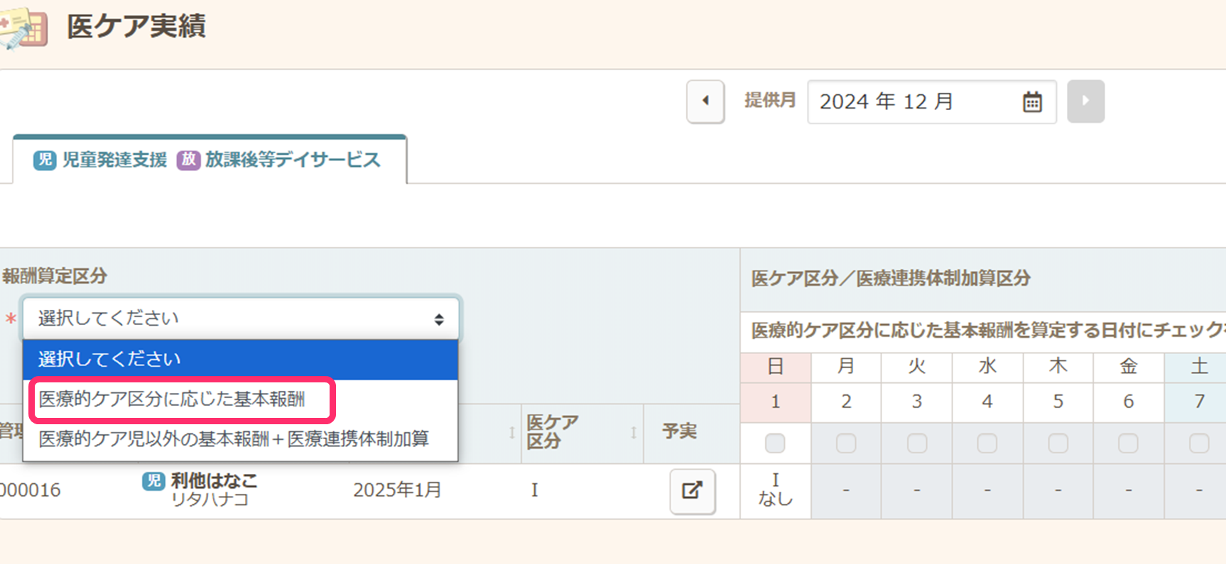 受給者証変更前に作成した日次実績の区分には修正が反映されません。受給者証を基本決定から医ケアⅠに変更した場合は、受給者証変更前に作成した日次実績で医ケア区分をⅠに修正してください。