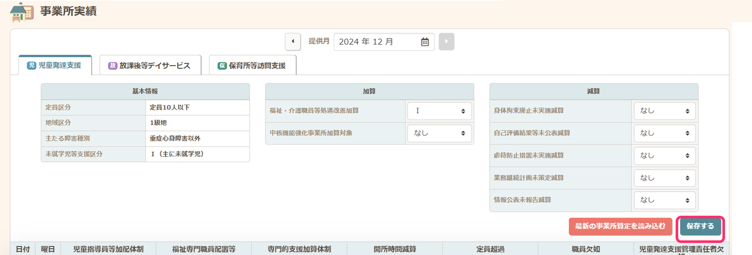 医療的ケア区分に応じた基本報酬を算定する日付にチェックが入っていることを確認します。 - )必要看護職員合計数 ≦ 配置看護職員合計数を満たさない場合