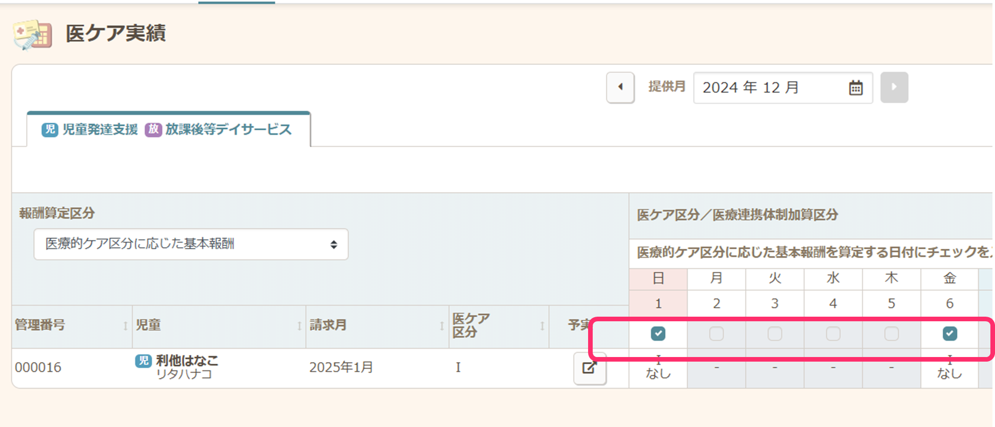 医療的ケア区分に係る基本報酬を算定する日のチェックを解除し、調整することが可能です。 ただし、医療連携体制加算の算定はできません。