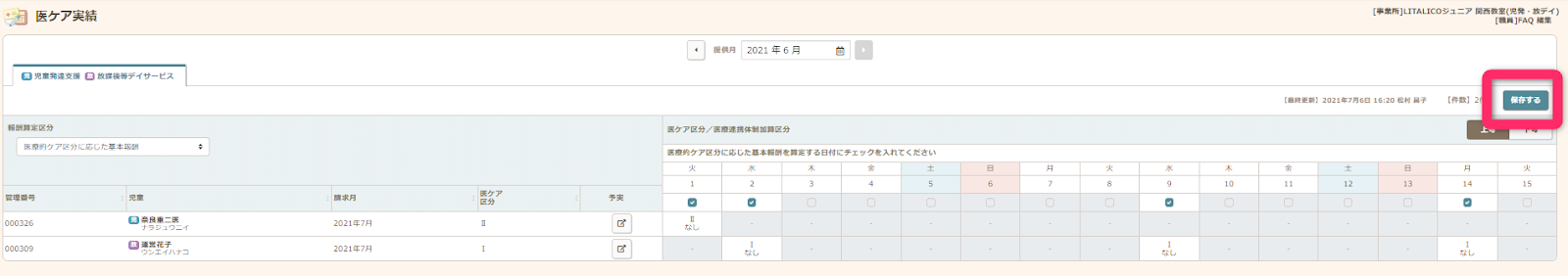 - 利用実績登録の画面で、医ケア区分が正しく選択されていることを確認し、【実績を保存する】をクリックします。
