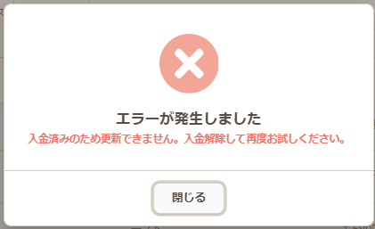 利用料請求で入金登録を行った保護者がいる場合、様式確定で取り消しのボタンを押した際に以下エラーが表示され、取り消しを行うことができません。