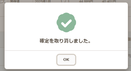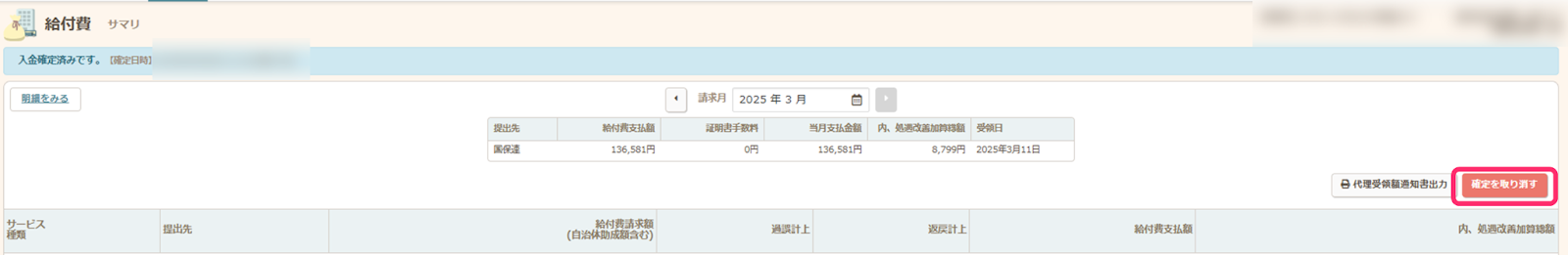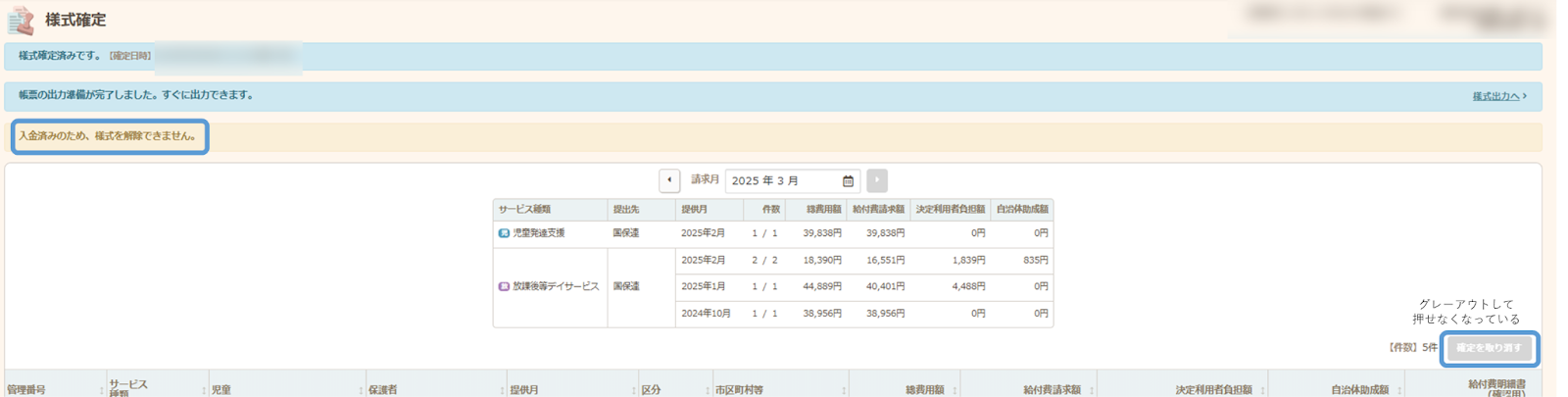 給付費の入金を確定している場合、「入金済みのため、様式を解除できません」と表示され、「確定を取り消す」のボタンを押すことができません。