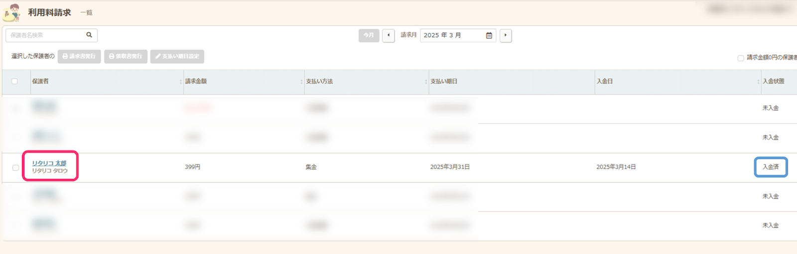 一覧で「入金済み」になっている保護者名をクリックします。 - 「入金を解除」をクリックします。
