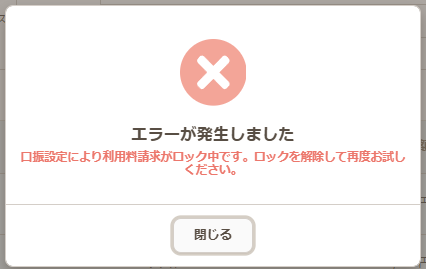口座振替がロック中の場合、様式確定で取り消しのボタンを押した際に以下エラーが表示され、取り消しを行うことができません。