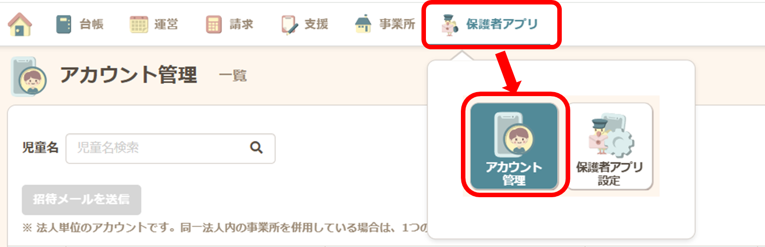 - グローバルナビ【保護者アプリ】から【アカウント管理】をクリックします。