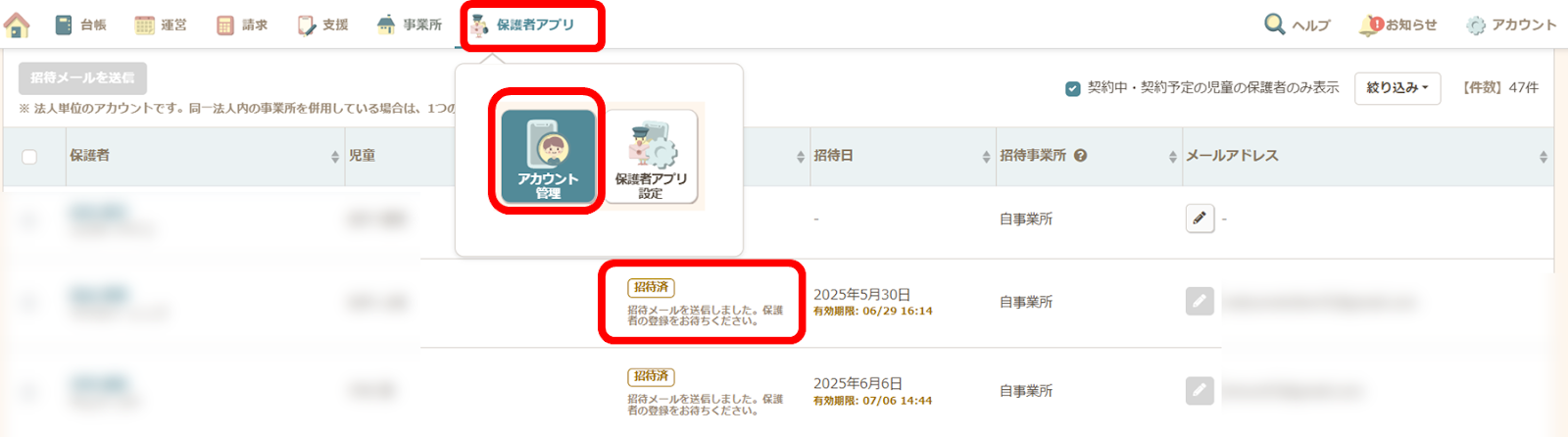 - 確認したい保護者の登録状況とメールアドレスを確認し、修正が必要な場合は修正して再度招待メールを送信します。
