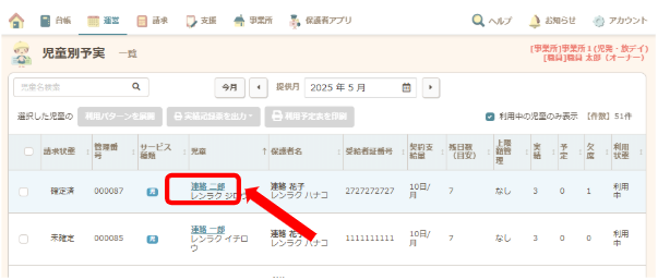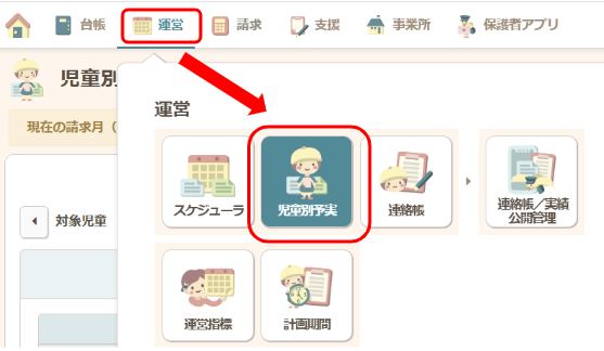 - グローバルナビの【運営】から【児童別予実】をクリックします。