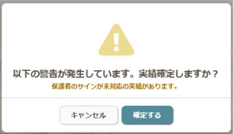 【保護者のサインが未対応の実績があります】という警告が出ますが、そのまま実績確定することができます。また、実績確定後でも連絡帳・実績を公開して電子サインをもらう事が可能です。