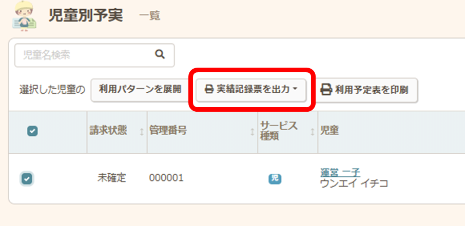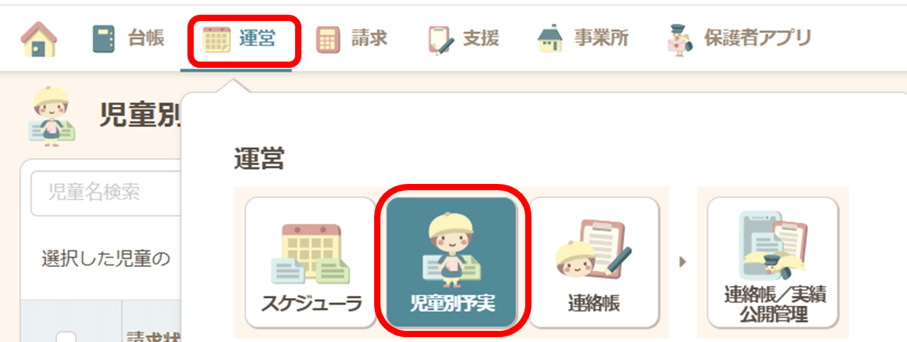 - グローバルナビ【運営】から【児童別予実】をクリックします。