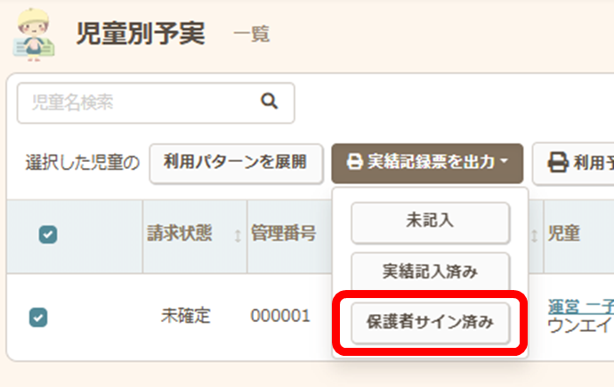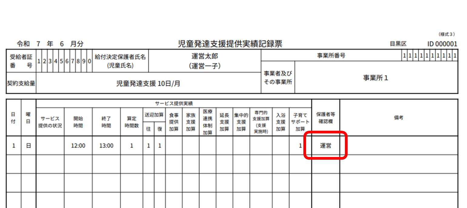 - 「保護者等確認欄」に電子サイン(保護者の苗字)が表示された実績記録表が出力されます。
