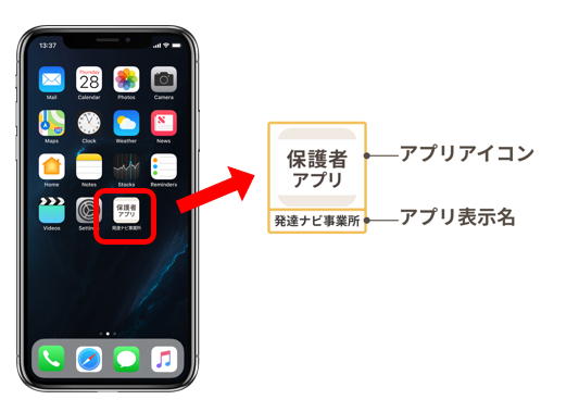 保護者のスマートフォン上に表示される、アイコンの名称です。