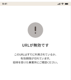 発行から30日経過しアカウント招待が無効になった場合、または事業所でアカウント招待を無効化した場合に表示される画面です。