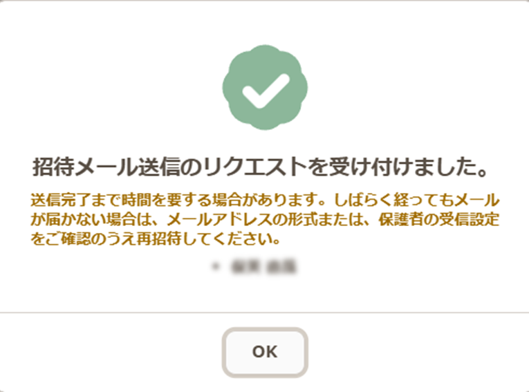 - 招待メール送信のリクエストを受け付けました。という表示が出ましたら保護者に招待メールが送付されたことになります。